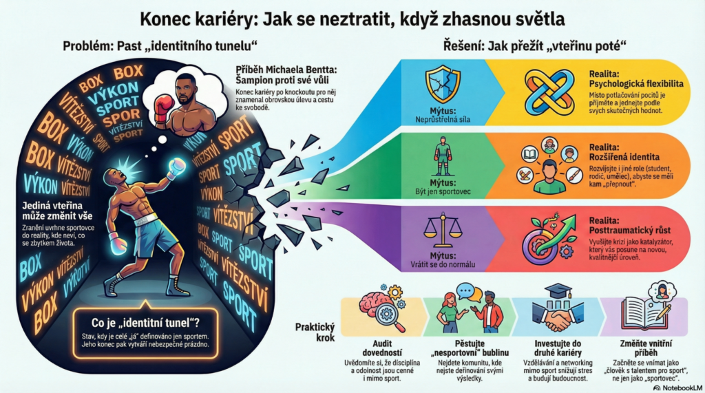 Příběh Michaela Bentta nám ukazuje klíčovou věc: konec kariéry není jen ztrátou činnosti, ale často i ztrátou jména, komunity a pocitu vlastní hodnoty, což věda popisuje jako riziko příliš úzké „atletické identity“. Když se identita sportovce nemá do čeho jiného přepnout, vzniká nebezpečné prázdno, které může vést k úzkostem, depresím a pocitu naprosté izolace, pokud se podcení psychologická část rehabilitace. Výzkumy potvrzují, že lidé se s koncem kariéry vyrovnávají mnohem lépe, pokud dokážou svou identitu rozšířit a uvědomit si, že nejsou jen „bývalými sportovci“, ale mají v sobě portfolio rolí – od mentorů a studentů až po rodiče či kreativce.